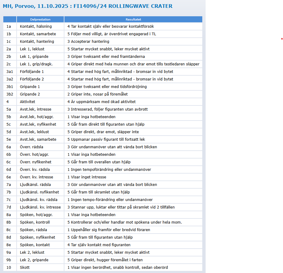 Dino, Rollingwave Crater, fortsätter att leverera tillsammans med matte. Nu har de varit på MH (mentalbeskrivning hund). Fint resultat där Dino inte visar några kvarvarande rädslor. Han är en trygg, social, nyfiken och lekfull grabb.